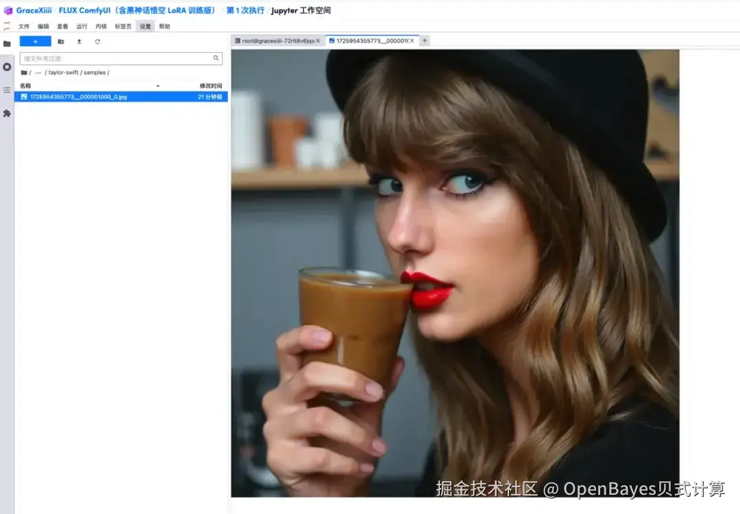 - 在左侧 「ai-toolkit」-「output」-「taylor swift」-「sample」文件里,可以看到我们刚刚 Test Prompt 的效果,如果效果还不错,就证明我们的模型已经训练成功了。