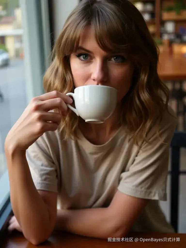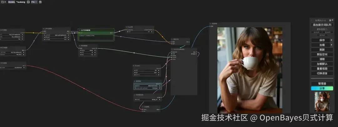 - 页面跳转后,在「LoRA 加载器」中选择刚刚训练好的模型,在「CLIP」中输入 Prompt(例如:a person is drinking coffee),点击「添加提示词队列」即可生成图像。