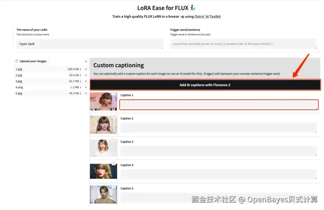 - 上传成功后,在每一个图像的后面手动添加英文文本描述,也可以点击「Add AI captions with Florence-2」自动生成文本描述。