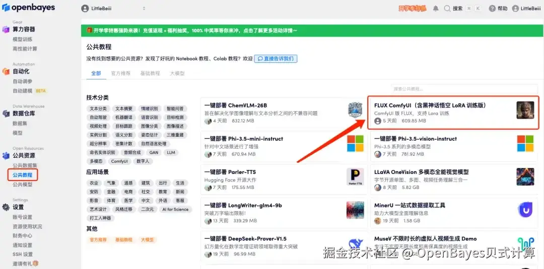 - 登录 OpenBayes.com,在「公共教程」页面,选择「FLUX ComfyUI(含黑神话悟空 LoRA 训练版)」。