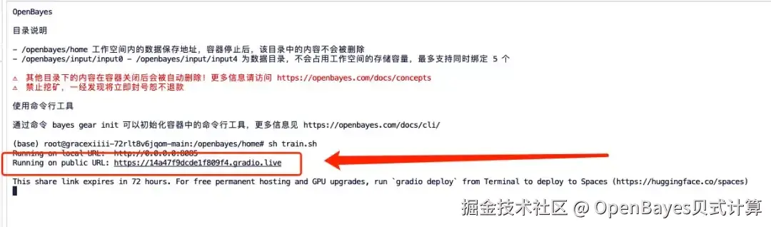 - 在终端输入「sh train.sh」,敲回车运行,待「Running on public URL」出现后,点击该链接。