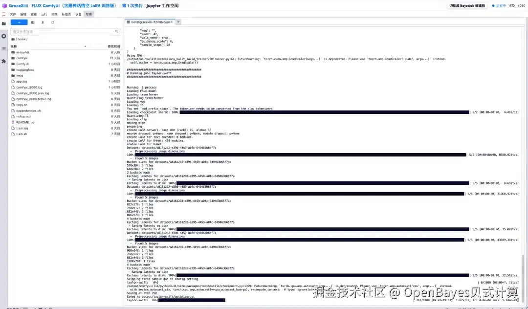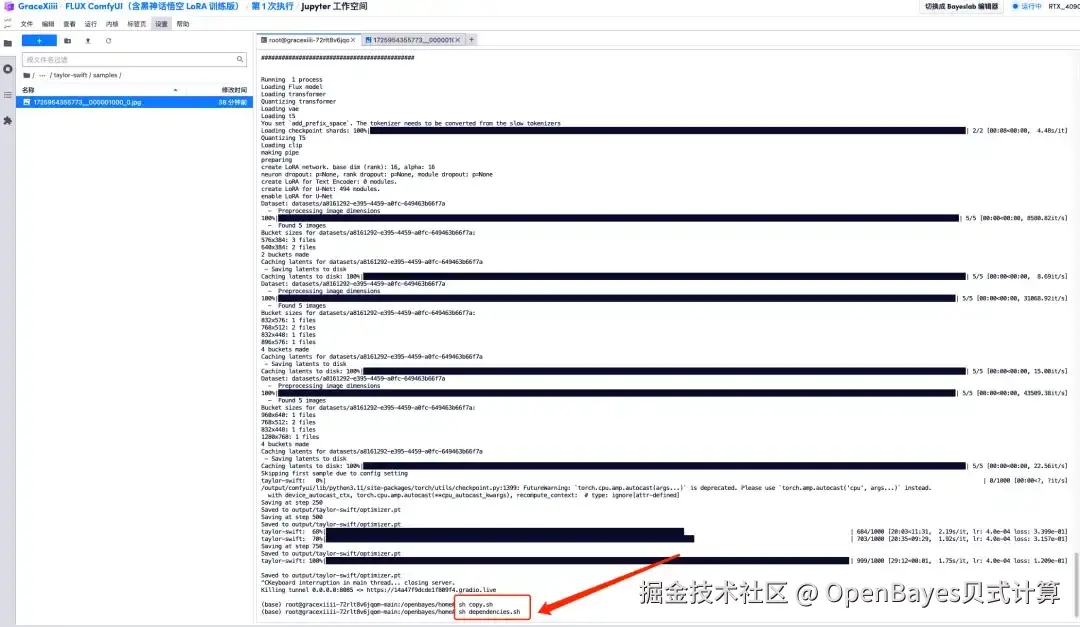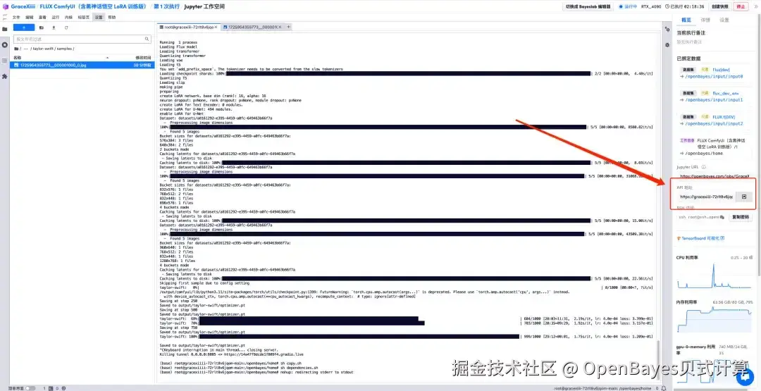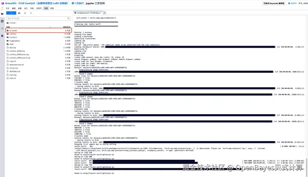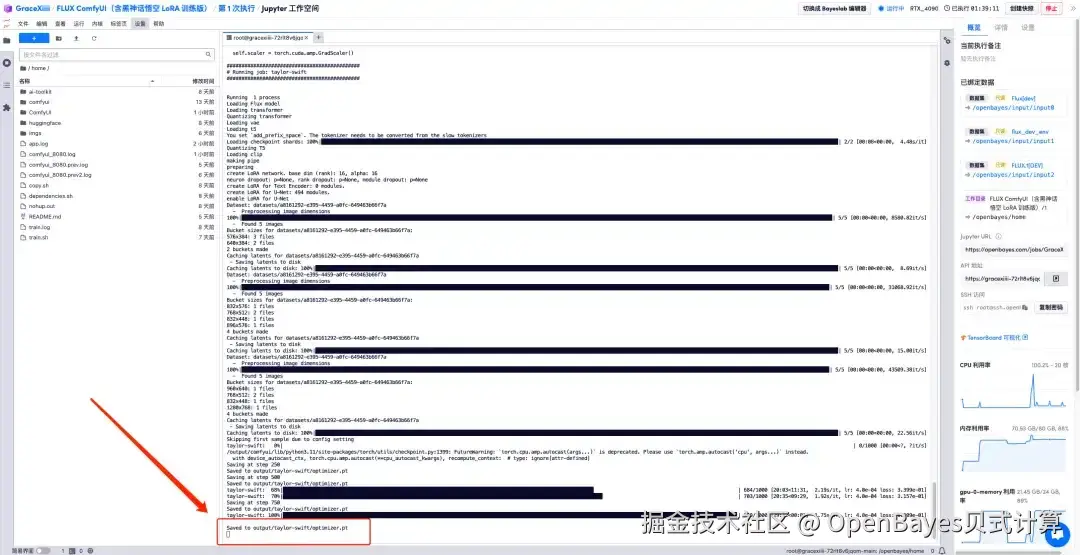 - 等待几分钟后,我们回到刚刚的终端界面,可以看到训练的进度条,大概 40 分钟左右即可训练完成。待「Saved to output/taylor-swift/optimizer.pt」出现,表示训练已完成。