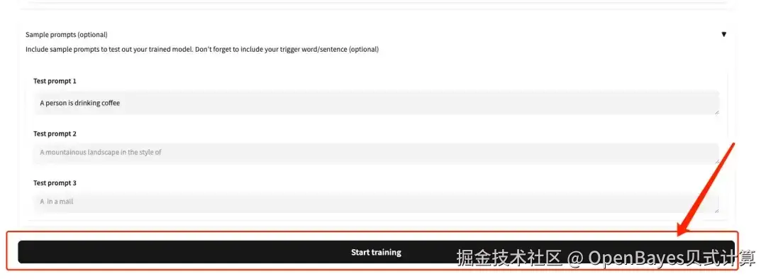 - 下拉至页面底部,输入一个 Test prompt(例如:A person is drinking coffee)后,点击「Start training」