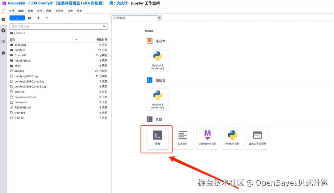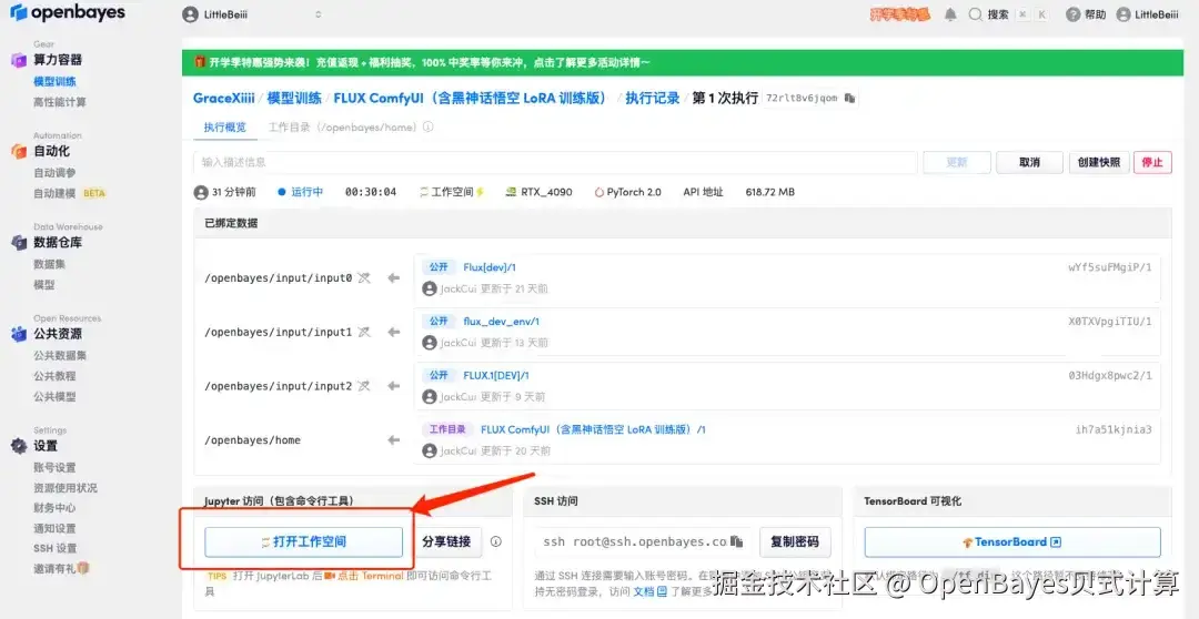 - 想要定制工作流,我们需要先训练 LoRA 模型,回到刚刚的容器界面,点击「打开工作空间」,新建一个终端。