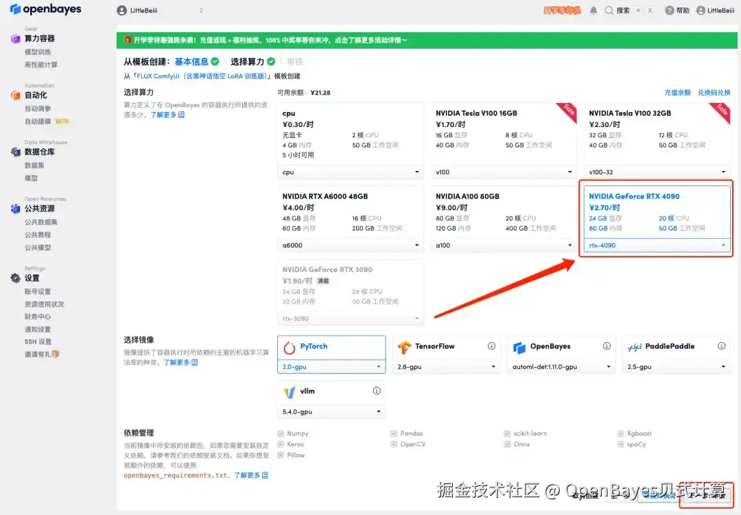 - 页面跳转后,选择「NVIDIA RTX 4090」以及 「PyTorch」镜像,点击「下一步:审核」。新用户使用下方邀请链接注册,可获得 4 小时 RTX 4090 + 5 小时 CPU 的免费时长!