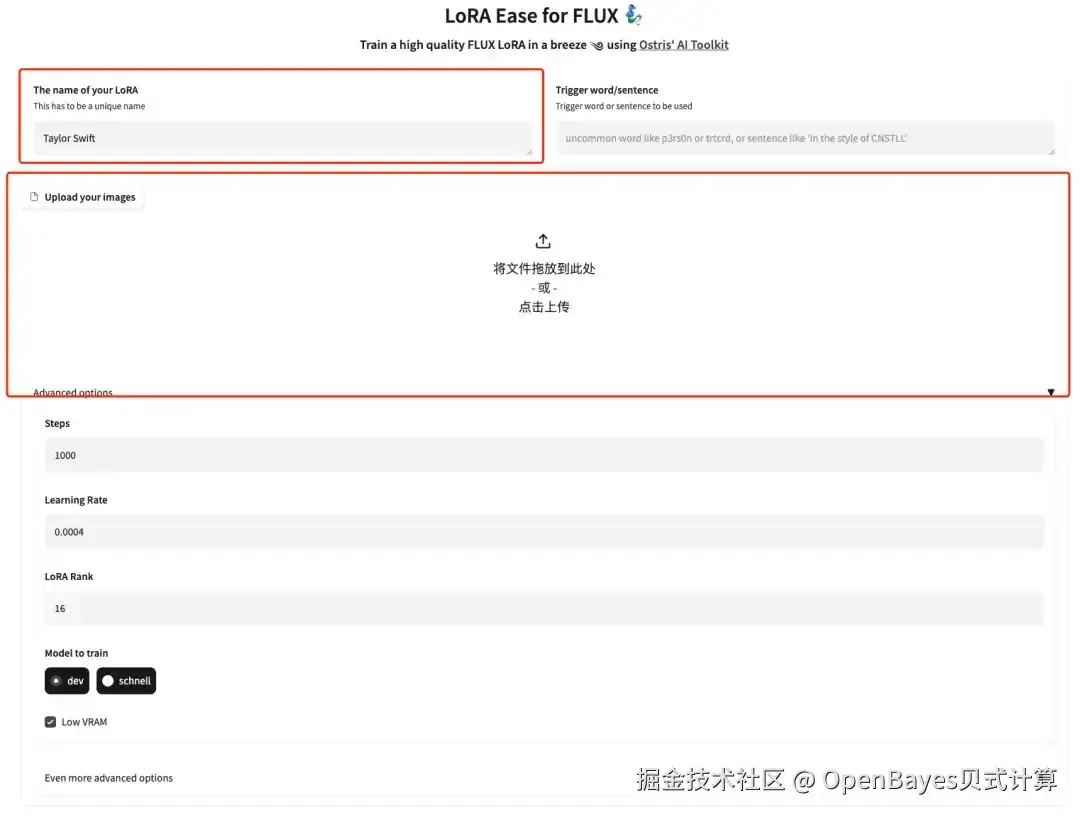 - 页面跳转后,输入模型的名称,并上传图片,这里上传 5 张霉霉的照片,请注意,图像需要是高分辨率正脸照片,人脸的比例大一些。图像的质量越好训练出来的模型效果越好。