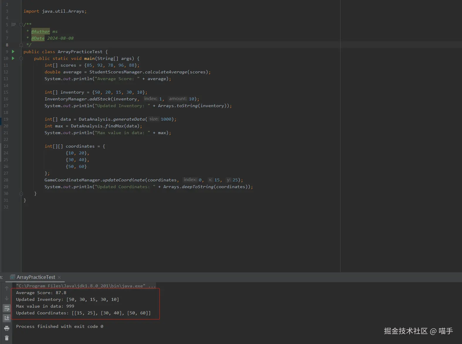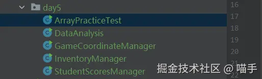 这段代码展示了如何在实践中测试不同场景下的数组操作。代码通过调用各种静态方法,演示了如何使用数组进行学生成绩管理、库存管理、大规模数据分析和游戏开发中的坐标管理。下面对每个测试场景进行详细解析。