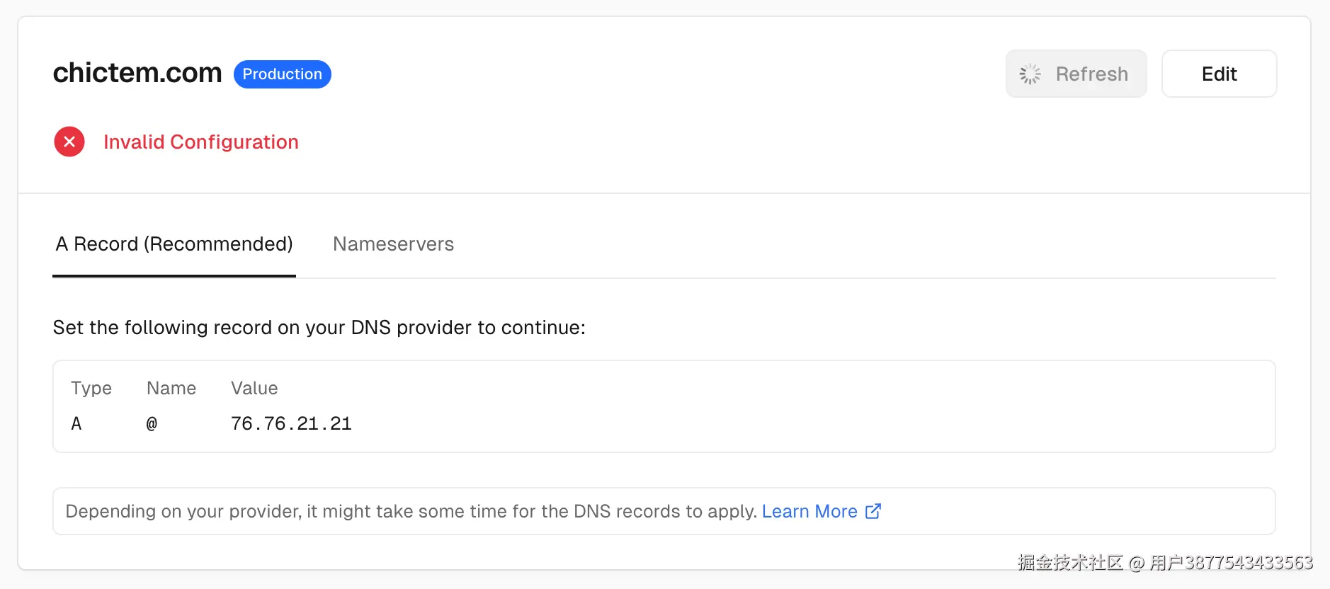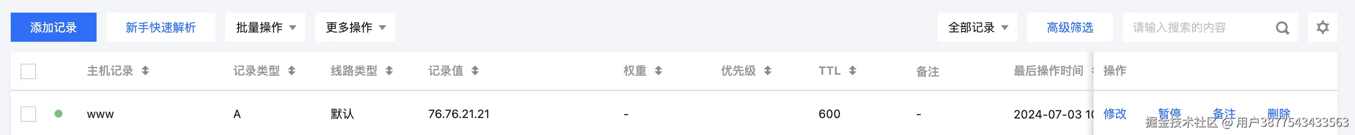 这里让我们添加一个 A 记录,解析到 76.76.21.21,我们这时候需要转到域名服务商这里配置下 DNS。