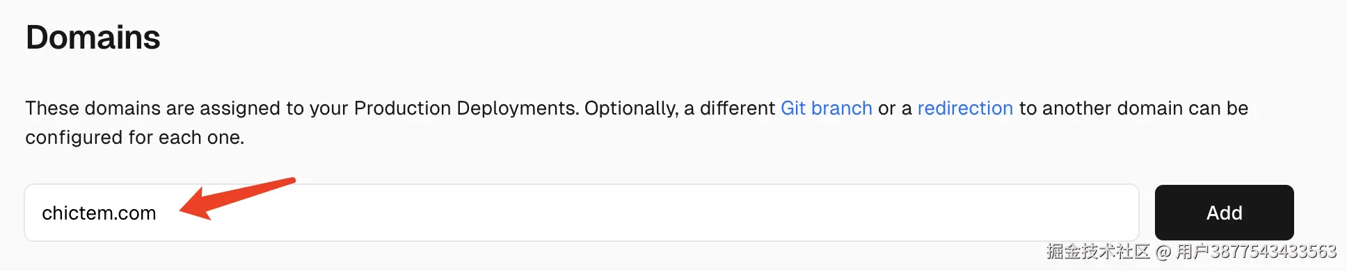 此处输入你想要配置的自定义域名,比如这里示例配置为 chictem.com,就直接填写 chictem.com,不带 https:// 前缀,点击 Add: