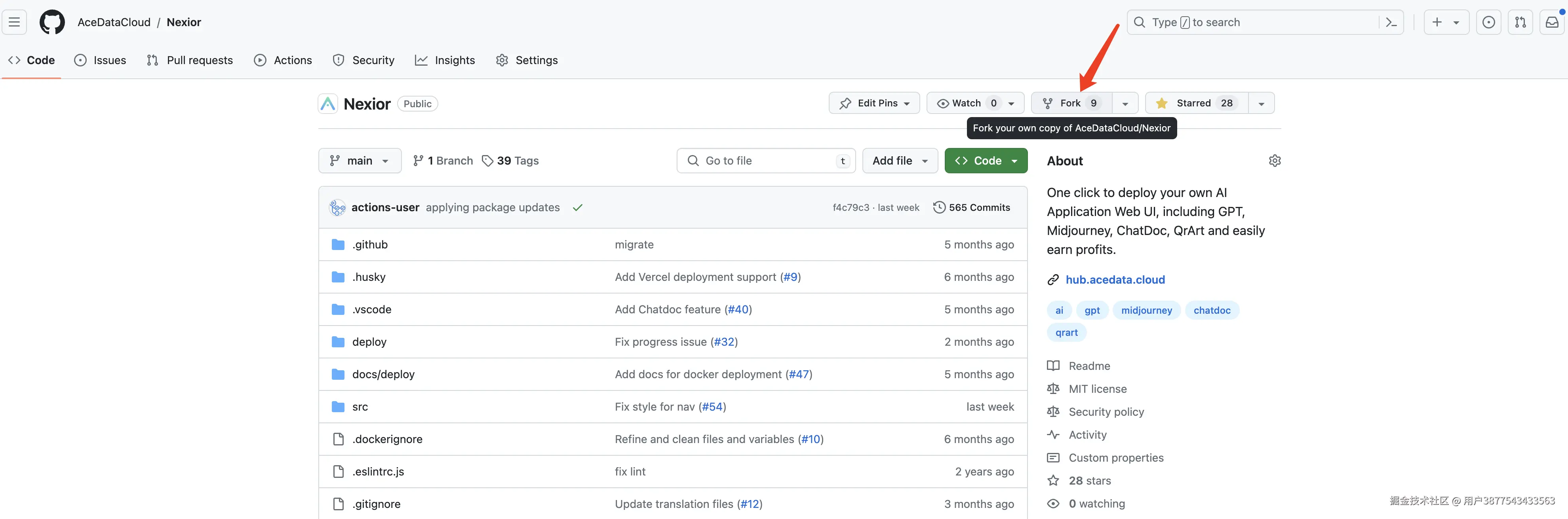 首先打开 Nexior 的 GitHub 仓库,地址为:github.com/AceDataClou…,然后注册或登录 GitHub 账号,点击 Fork,克隆一份代码到自己的本地仓库,如图所示: