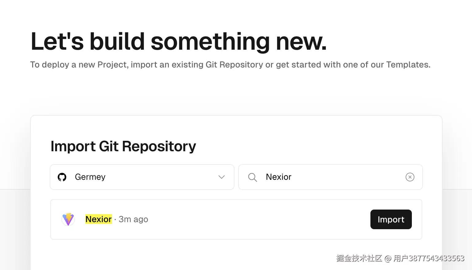 此时,Vercel 便展示了你的 GitHub 仓库,选择刚才 Fork 的 Nexior 仓库即可,如图所示:
