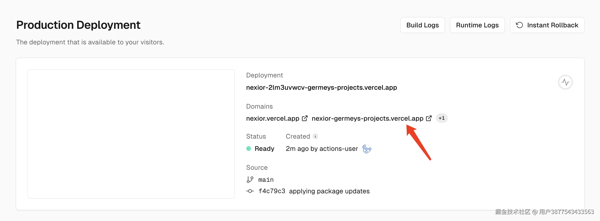 点击 Continue to Dashboard,我们便可以看到 Vercel 为我们生成的预览域名,如图所示: