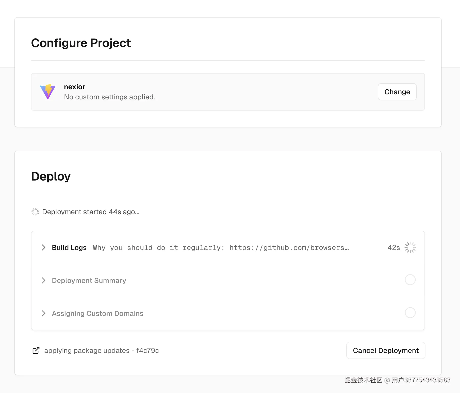 点击 Deploy 之后,Vercel 便开始构建整个项目并进行部署,我们不需要做任何操作,只需等待 1-2 分钟左右即可,如图所示: