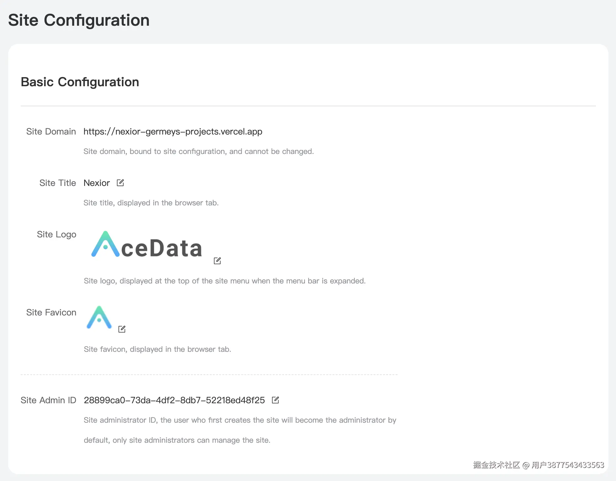 打开之后注册登录一下,比如用邮箱、GitHub 登录都是可以的,登录完毕之后便可以看到一个配置页面,比如 Site Configuration,我们可以自行修改该站点的标题、Logo、Favicon、管理员等信息,如下图所示: