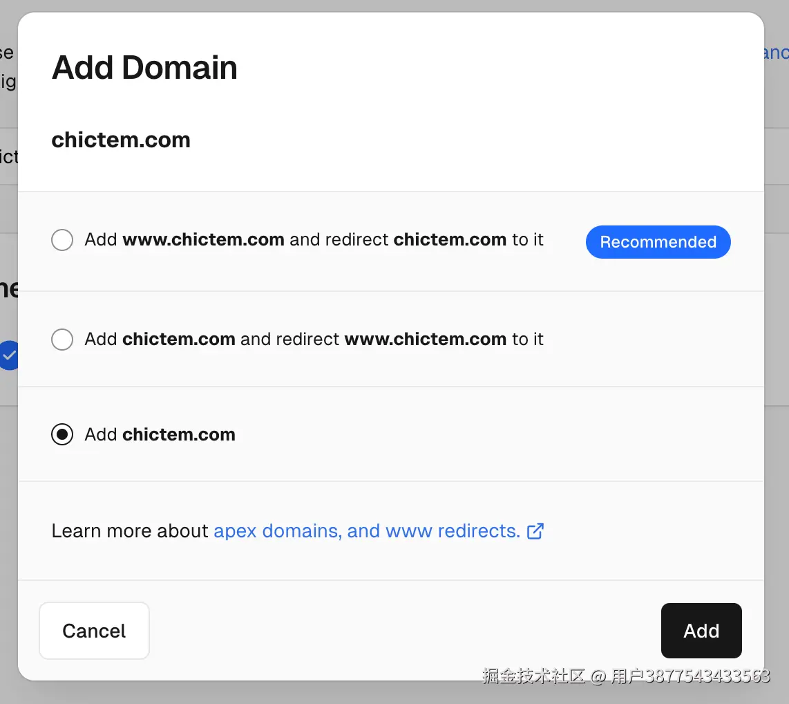 接下来 Vercel 提示要选择域名配置的选项,推荐我们也添加一个 www 开头的域名,这个可加可不加,添加了之后就可以 www 开头的域名也能访问到此网站。这里我们直接选择最后一项直接添加根域名: