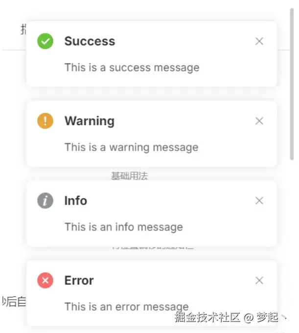 3、多种类型:支持多种类型的消息,如成功(Success)、警告(Warning)、错误(Error)和 消息(Message)等。