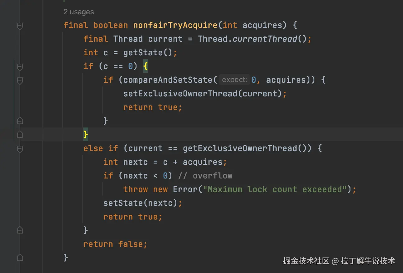 这里和公平锁也是不一样,它没有判断队列情况,继续用CAS方式去看能否修改state获取锁。