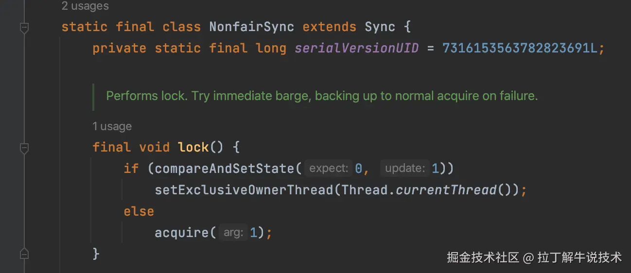 一个是NonFairSync类,也是实现Sync类,实现的是非公平锁。