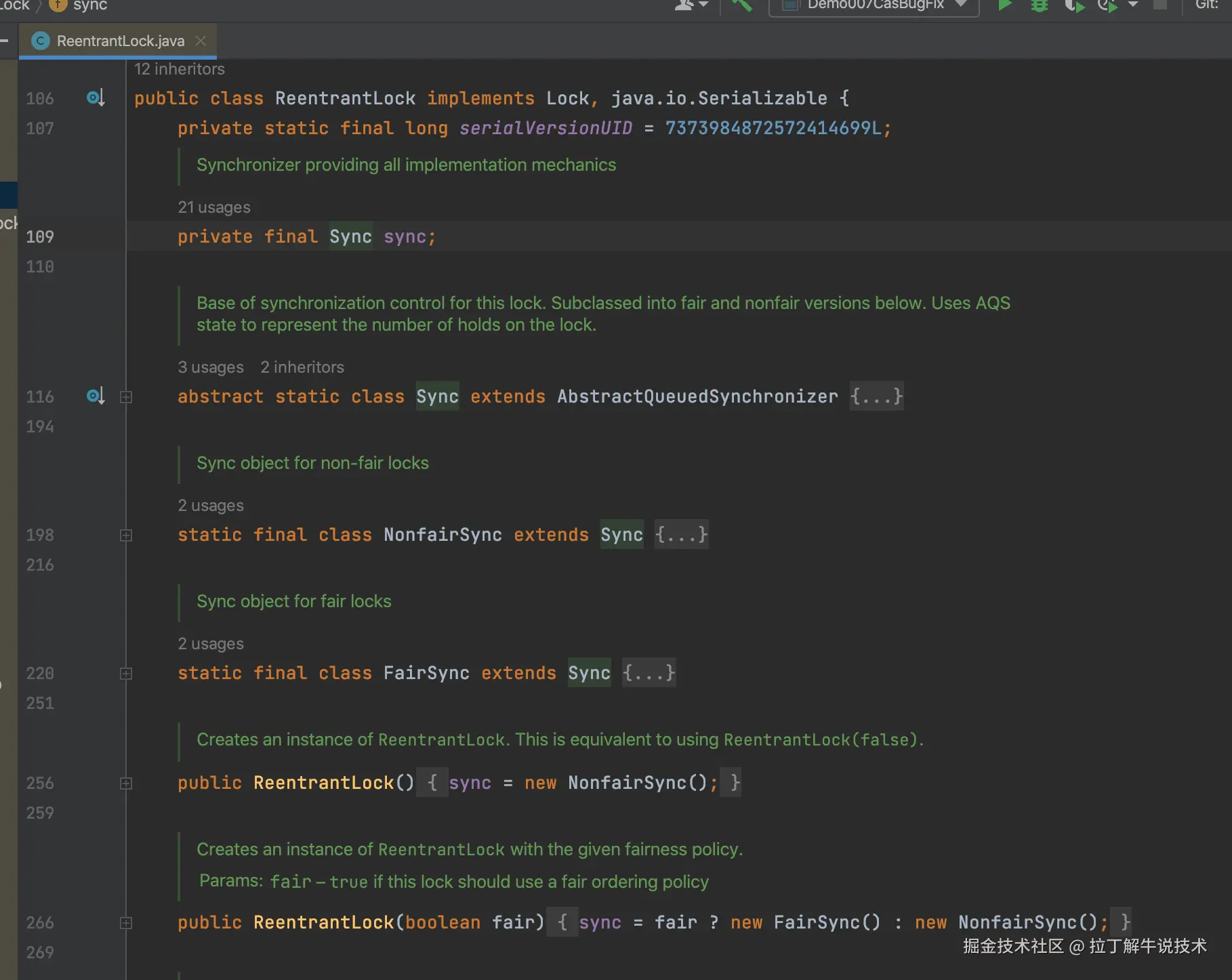 少废话,一句话总结它的原理:ReentrantLock是AQS的具体实现,实现了公平锁和不公平锁。ReentrantLock源码里有三个内部类。