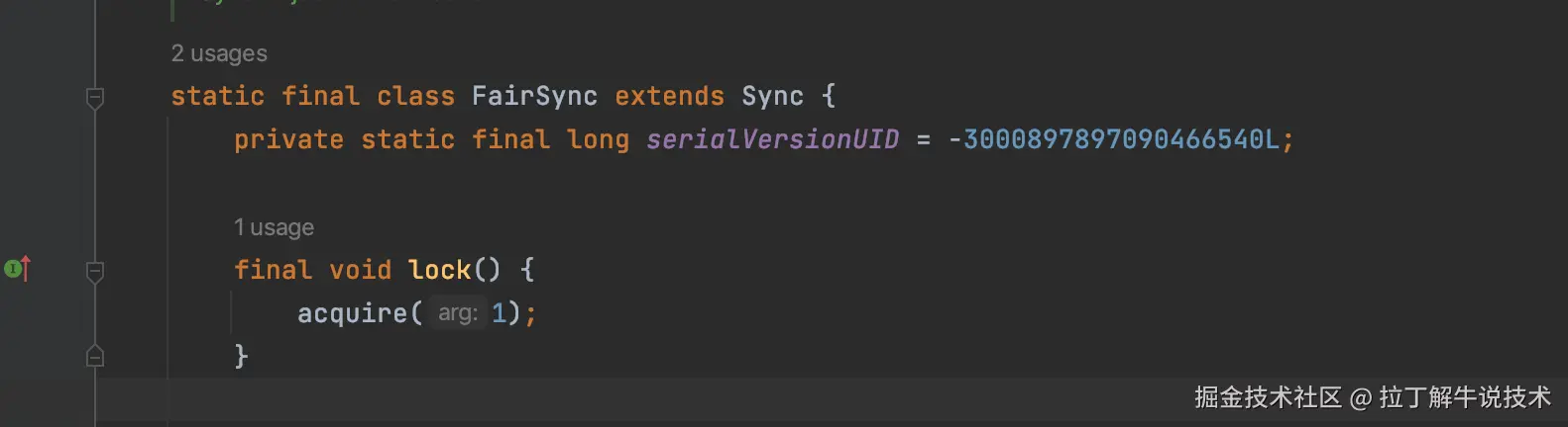 我们直接看源码,公平锁的lock加锁是acquire(1)方法。