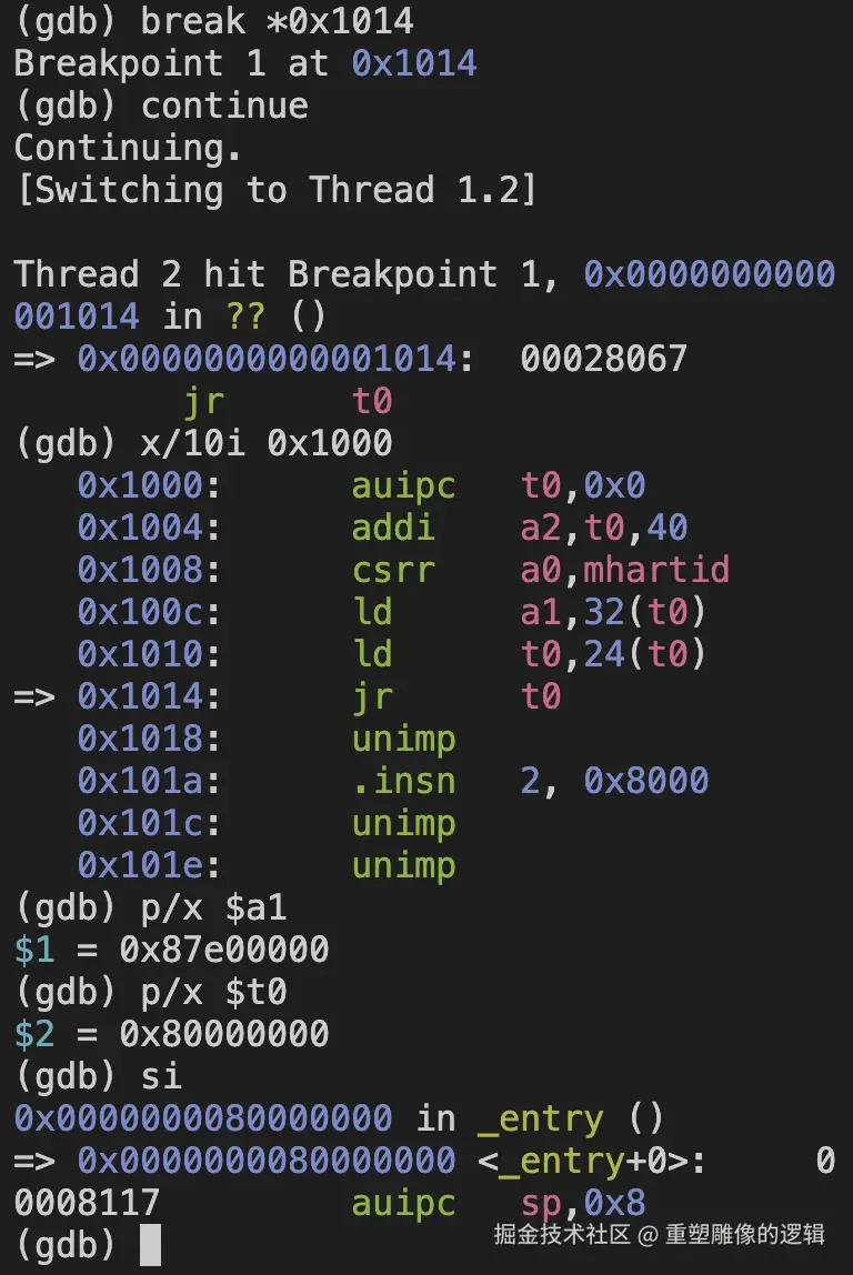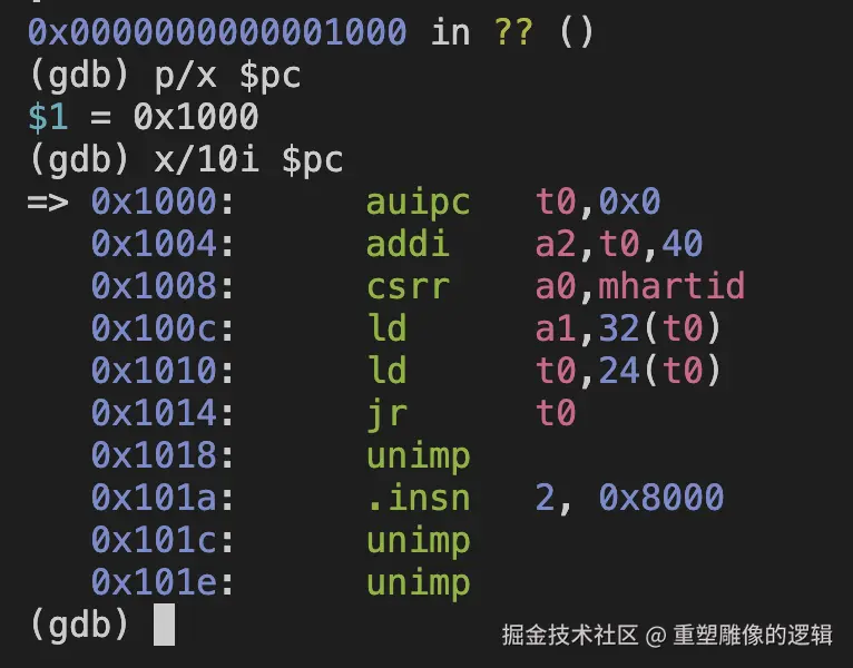 非常非常地不幸,通过Debug,我们发现qemu启动时的第一条指令地址在 0x1000, 根本不是前面分析的 0x8000_0000。