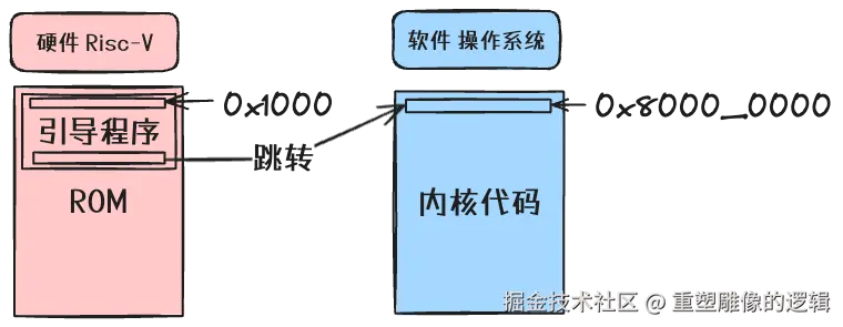 首先是 Risc-V 在通电后,首次读取它内部的只读寄存器的引导程序(硬件部分),引导程序会初始化处理器内部的寄存器,然后跳转到地址 0x8000_0000 处继续运行。因为操作系统的代码就放在 0x8000_0000 处,所以操作系统的代码开始执行。
