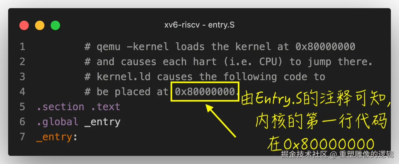 因为这段跳转程序是固定在硬件电路中的,所以操作系统内核第一行代码在内存中的位置由处理器硬件决定,xv6的源码进行了适配。