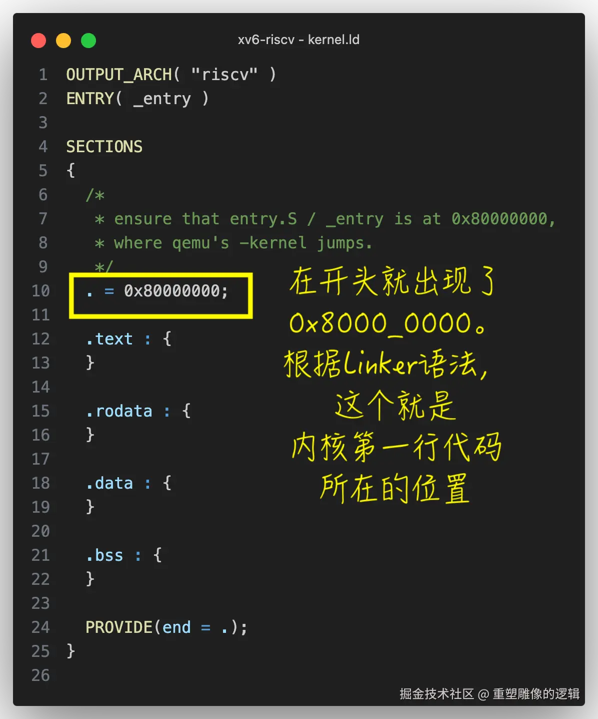 接着我们打开 kernel.ld 源码来看看它是怎么配置的吧。在它的开头,就出现了我们要找的字符串 0x80000000。我们不了解链接器的语法,也能猜出来这是用来配置内核第一行代码放置的位置。