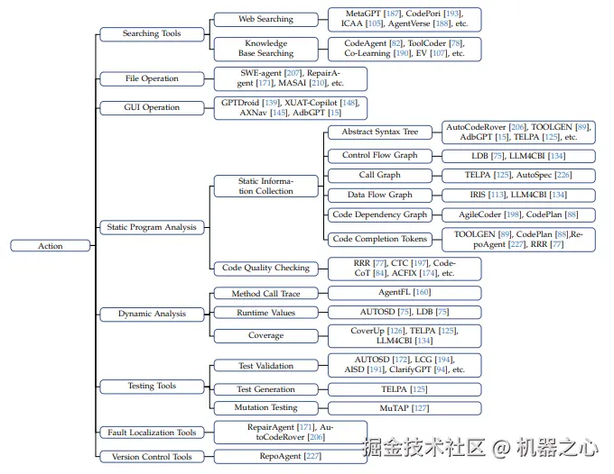 为了进一步提升 Agent 在软件开发和维护任务上的能力,目前 Agent 的行动模块中集成和使用了大量的工具,主要包括搜索、文件操作、静态程序分析、动态分析、测试、版本管理工具等。