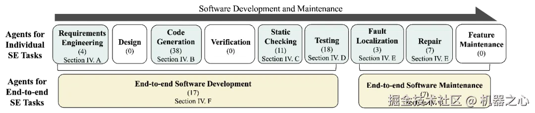 如图 1 所示,目前 Agent 已基本覆盖了软件开发和维护的全流程,不仅可以解决某个特定的软件开发环节(例如静态检查和测试),而且在应对更复杂的端到端的软件开发和维护任务上也表现出了巨大潜力,包括: