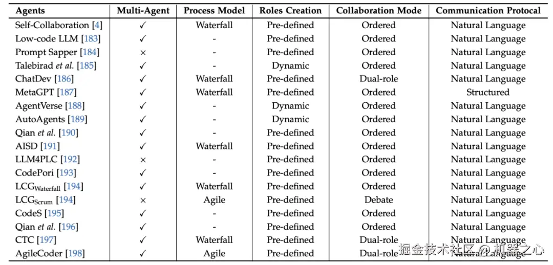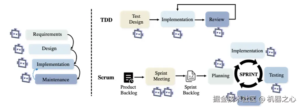 其中,有些 Agent 在工作流设计上主要遵循了现实软件开发中常见的软件过程模型,包括瀑布模型和敏捷开发(测试驱动开发和 Scrum)。