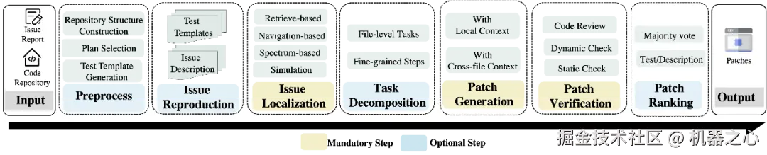 目前,面向端到端软件维护任务的 Agent 遵循着 “缺陷定位 - 补丁生成 - 补丁验证” 的基本工作流程;在此基础上,不同 Agent 选择性地引入了预处理、故障重现、任务分解、补丁排名等步骤。