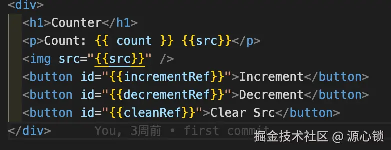 看到/apps/demo/src/components/couter/index.html文件,我们现在的目标就是把这个看起来比较潦草的模板中的变量用我们的状态替换掉。