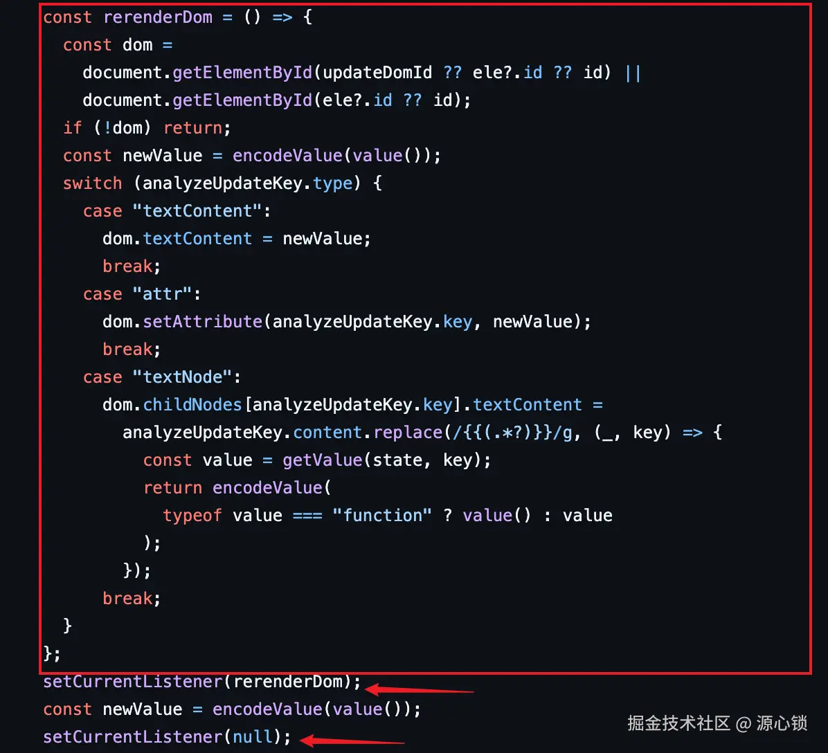 进一步在实际使用时,则基于当前节点分析出要修改的部分,通过闭包变量持久化一个修改的 task,再利用 getValue 函数从收集到的 state 中拿到 getter 函数,通过函数调用的方式拿到最新的值再基于 task 修改 dom 节点。