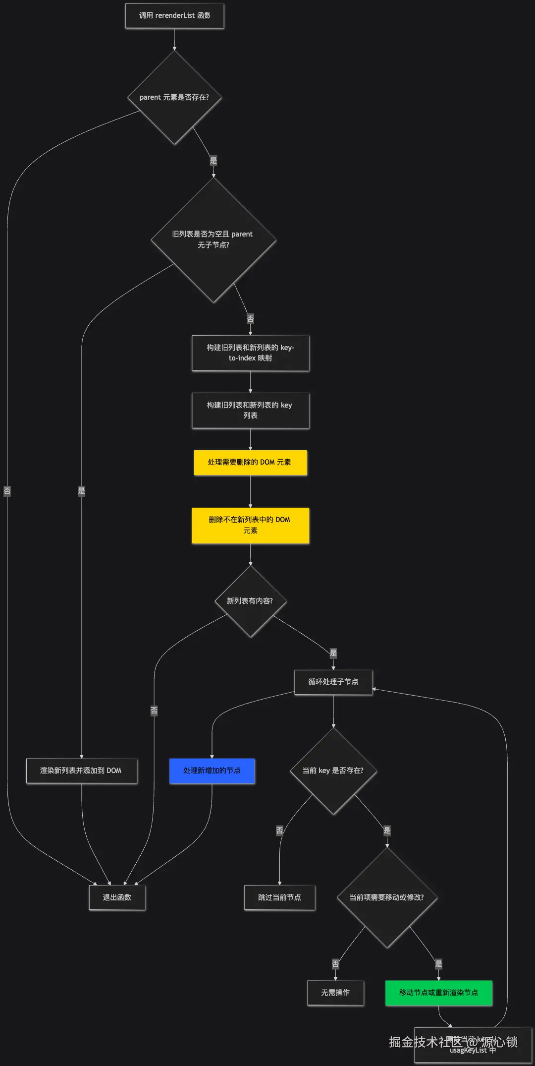 diff 的思路即这部分的核心思路,可以看到我们的流程图。黄色部分代表删除,蓝色部分代表新增,绿色部分则是移动或者删除。