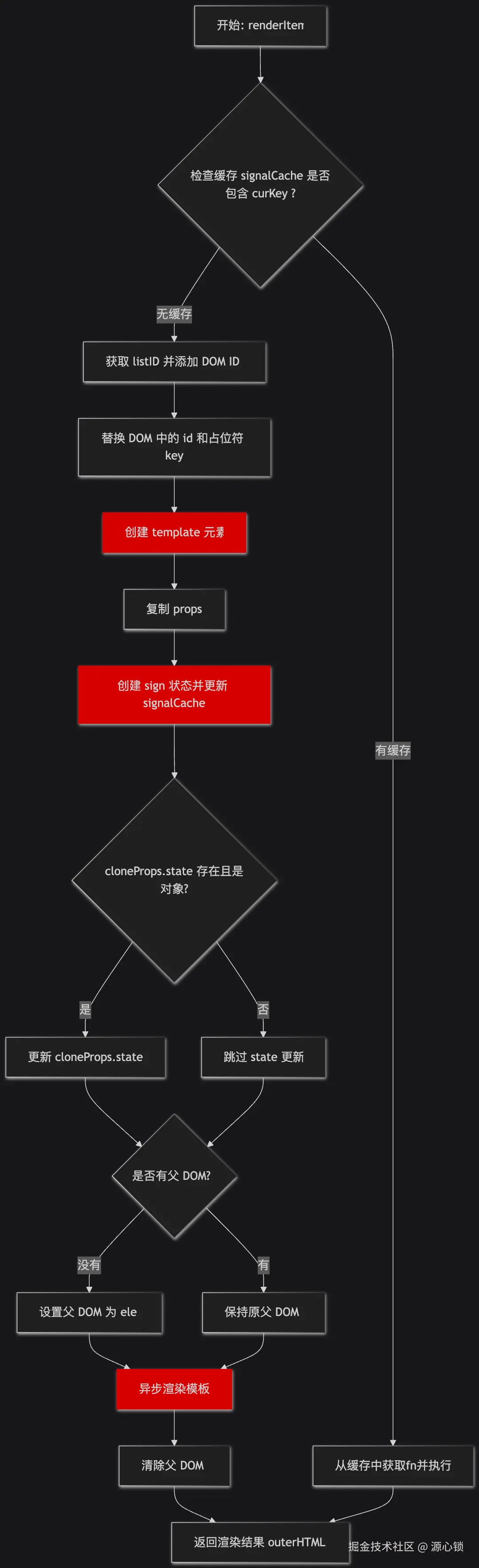 其中 renderItem 的逻辑可以用这份流程图来显示。其中红色标注的部分即核心的逻辑,extreme 在批量渲染时,会将每一个子项都转换成 signal 对象,进而如果子项存在修改,也能进行监听并重新渲染。