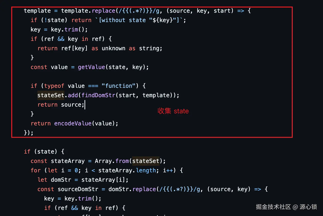 这一步可以用下边的代码(useTemplate.ts 第21行)实现,通过replace取出大括号内的变量,再基于.操作符在我们的状态中取值,经历了这一步,我们即成功做到了将模板中的双大括号替换成我们的值。