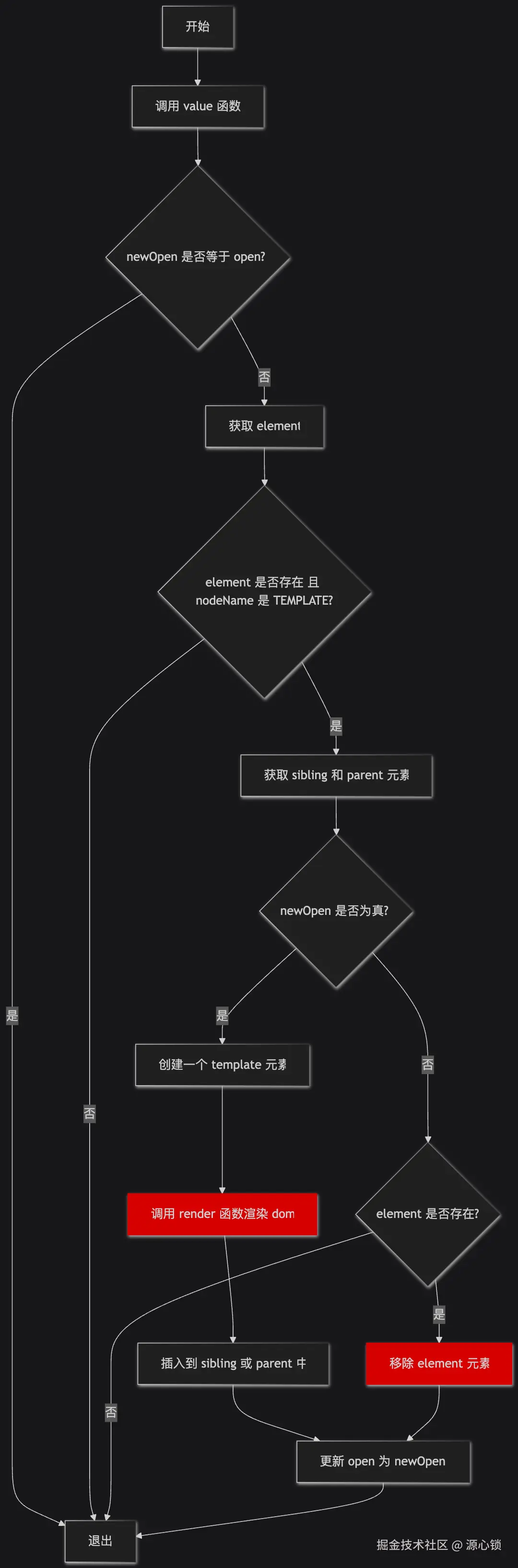 分两部分,首先解释流程图中红色部分,这一部分是在做渲染和卸载掉处理。由于条件渲染每次都要实际清除 dom,目前的处理方式是在每次条件变化时用 dom 字符串重新执行 render 函数,这种方式对性能有一定损耗并且不利于修改成编译时,实际上应该可以有更好的方式才对。