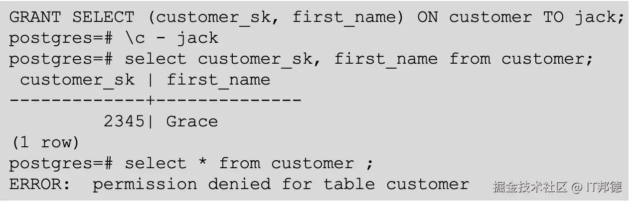 GRANT SELECT (customer_sk, first_name) ON customer TO jack;