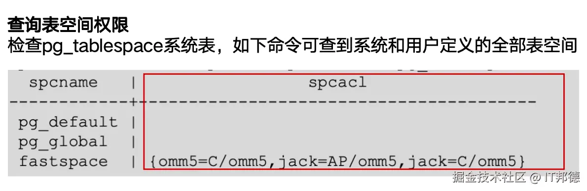 postgres=# GRANT CREATE ON TABLESPACE mytbs TO jack;