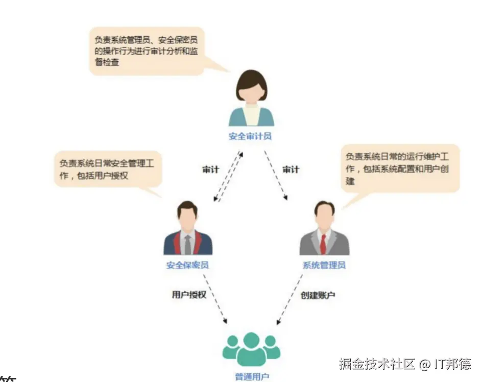 三权分立的基本思想是将系统中关键操作的权限分配给不同的角色, 来避免单个用户或角色能够完全控制整个系统, 这通常包括以下三个角色: