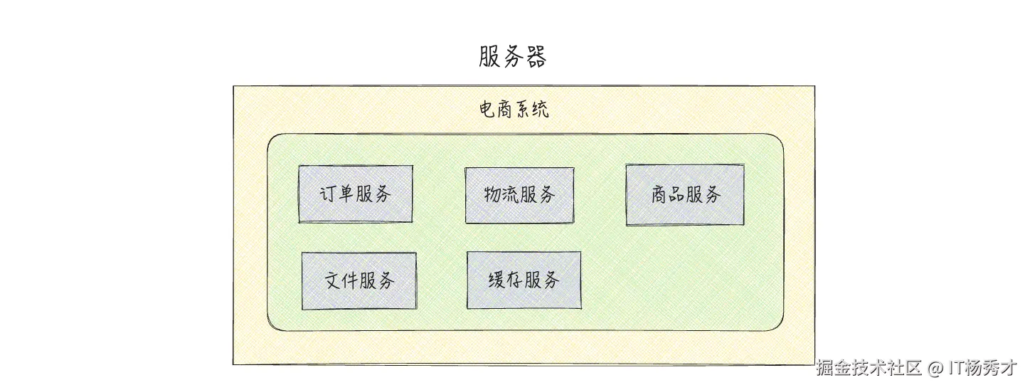 单机其实很好理解,如上面集中式系统的图示,比如一个电商系统,最基本的需求,用户需要查看商品,所以需要对外提供商品服务,用户还需要查看物流信息,以及一些售后处理,所以系统还需要提供订单服务和物流服务。除了这些业务服务之外,系统还有一些提供基础功能的服务,比如文件服务,缓存服务等,在单机系统中这些服务都集中在一台机器上运行,这就是单机架构