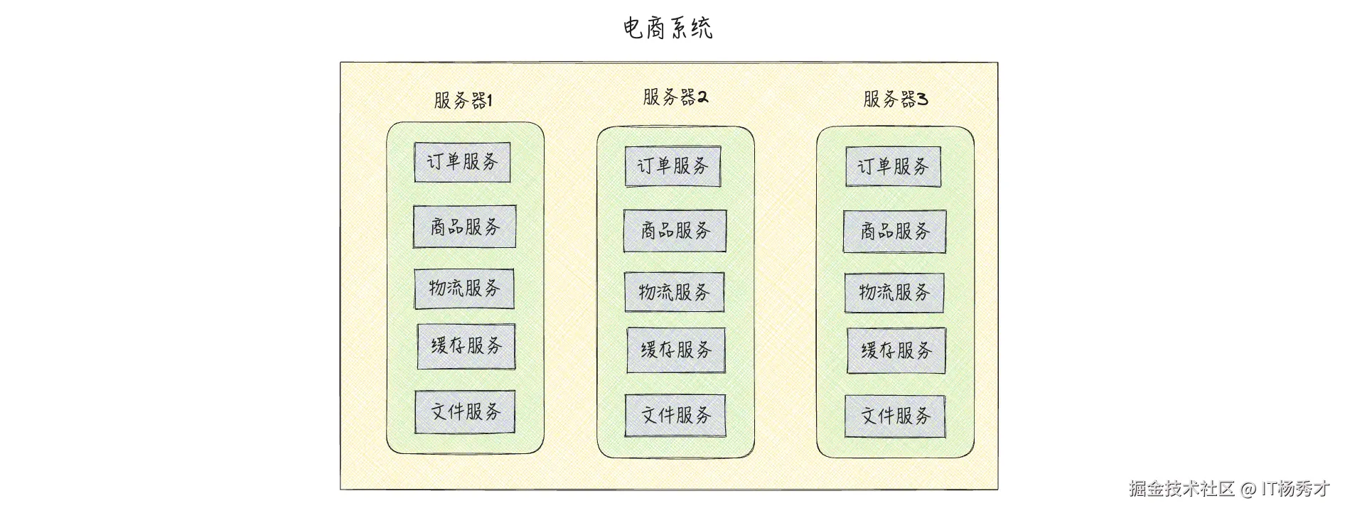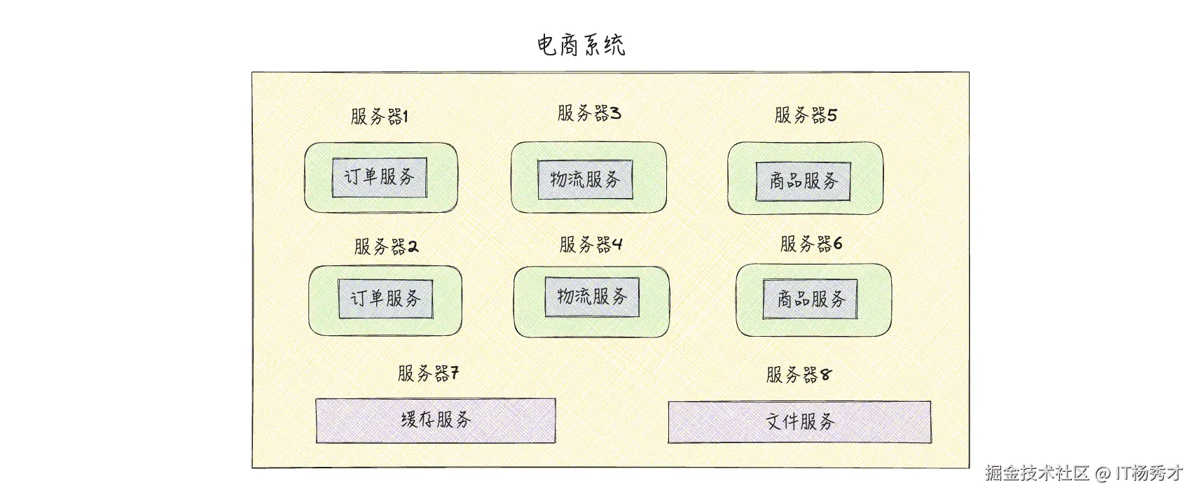 上图所示就是一个分布式系统,并且是一个分布式集群,将电商业务拆成了多个服务部署到了不同的服务器上,并且订单服务,物流服务,还有商品服务都是集群化部署,部署了多份。当然这个例子只是为了说明分布式和集群的关系,现在真正的业务场景一般不会这样部署了,不会一台服务器部署一个应用服务,都是容器化多实例部署