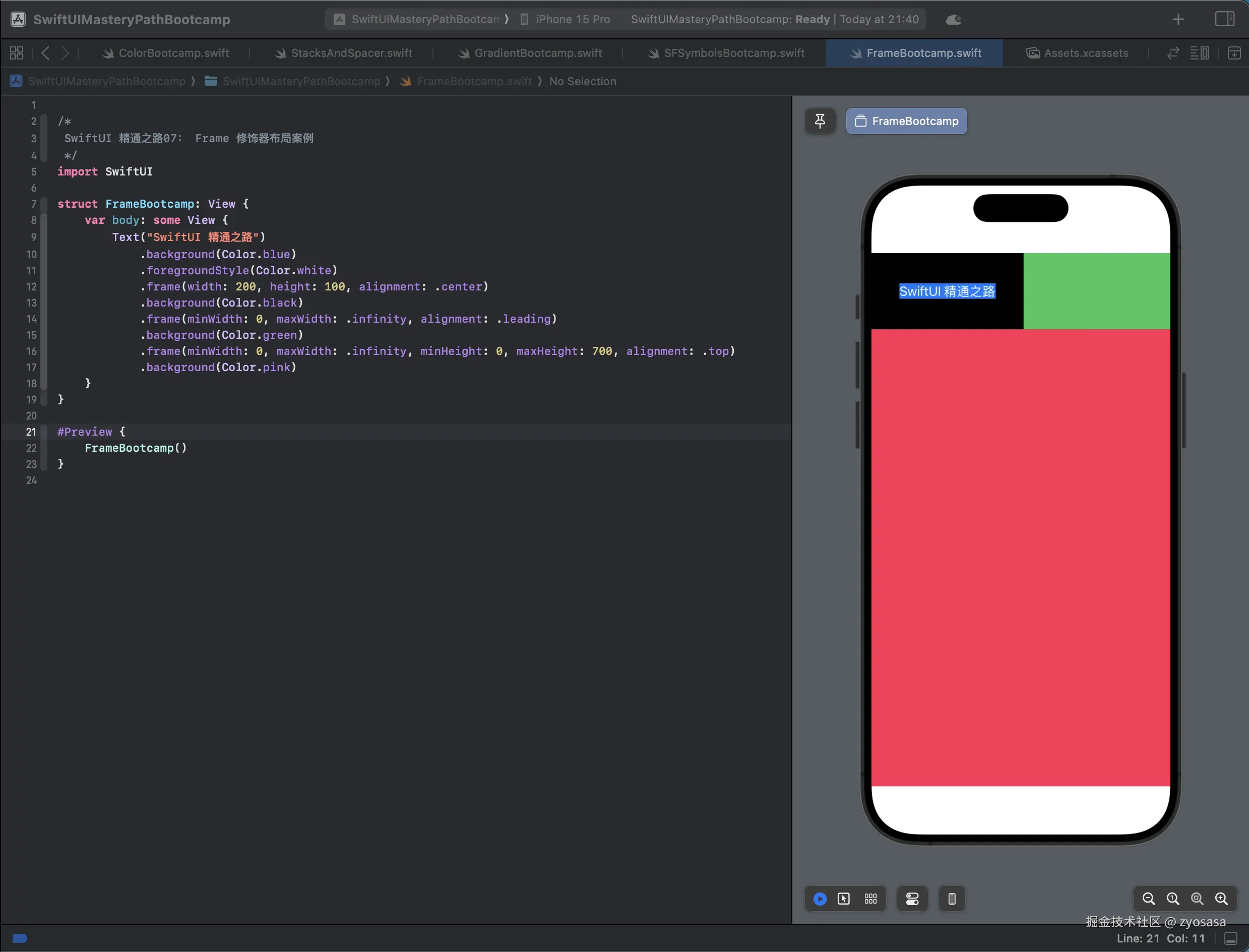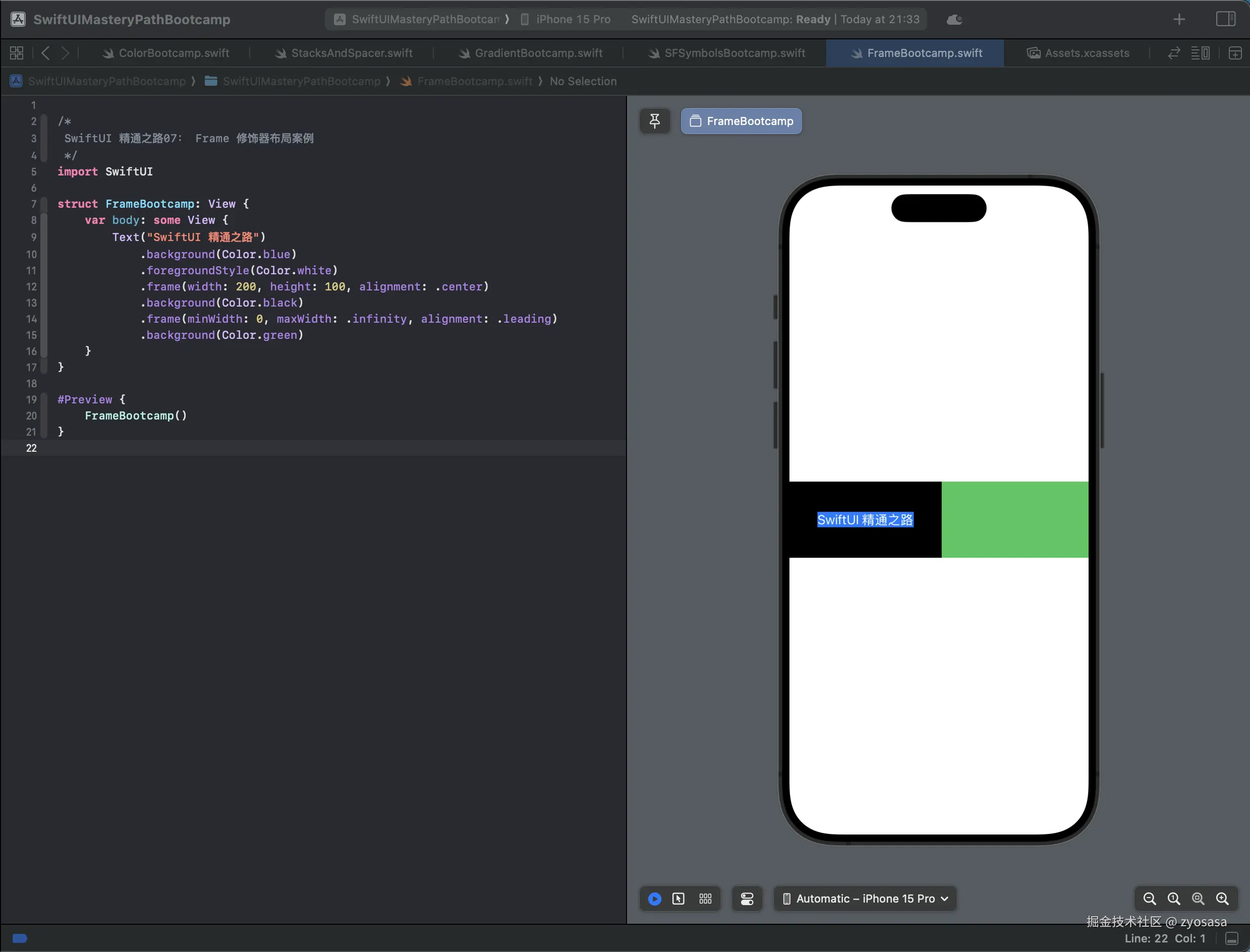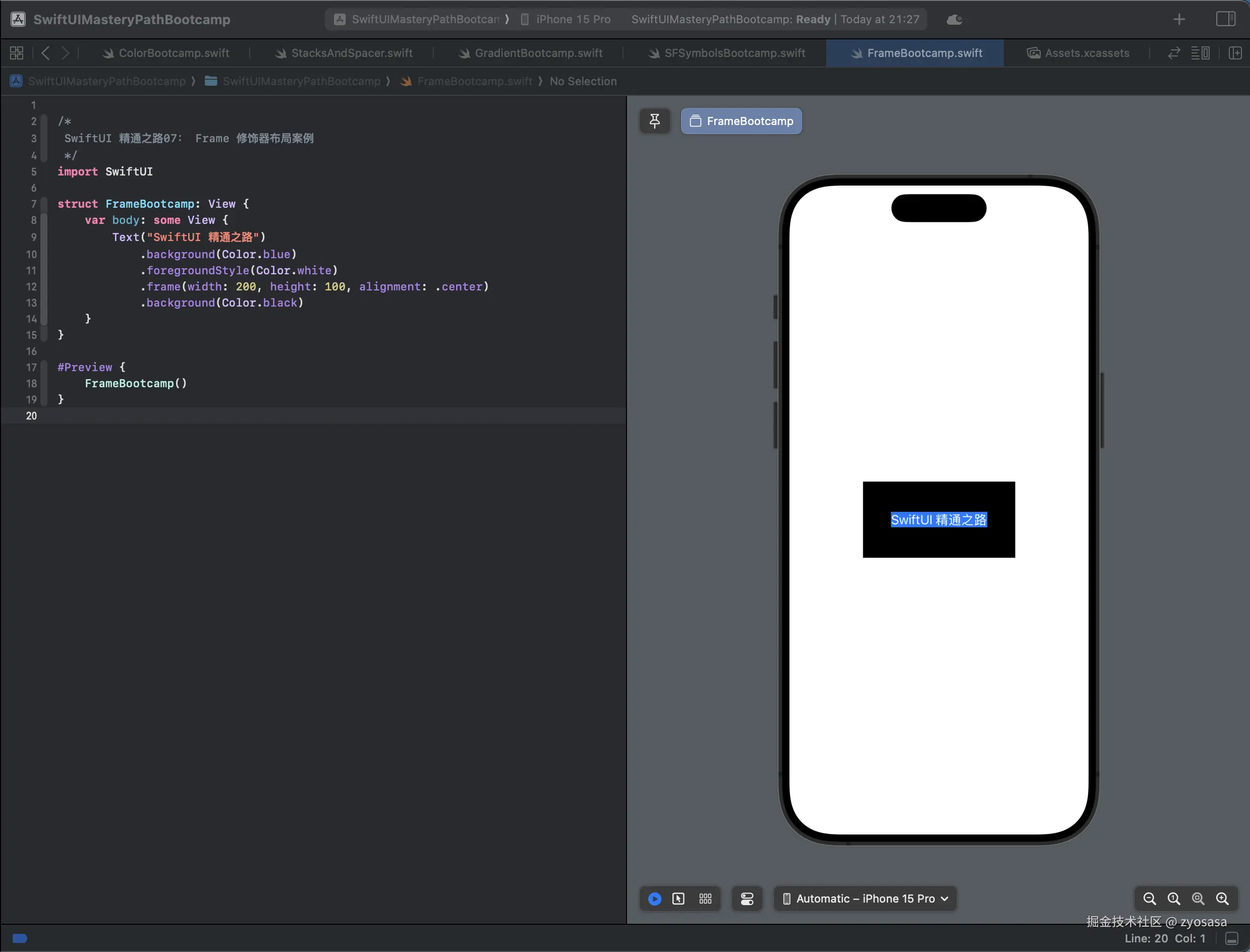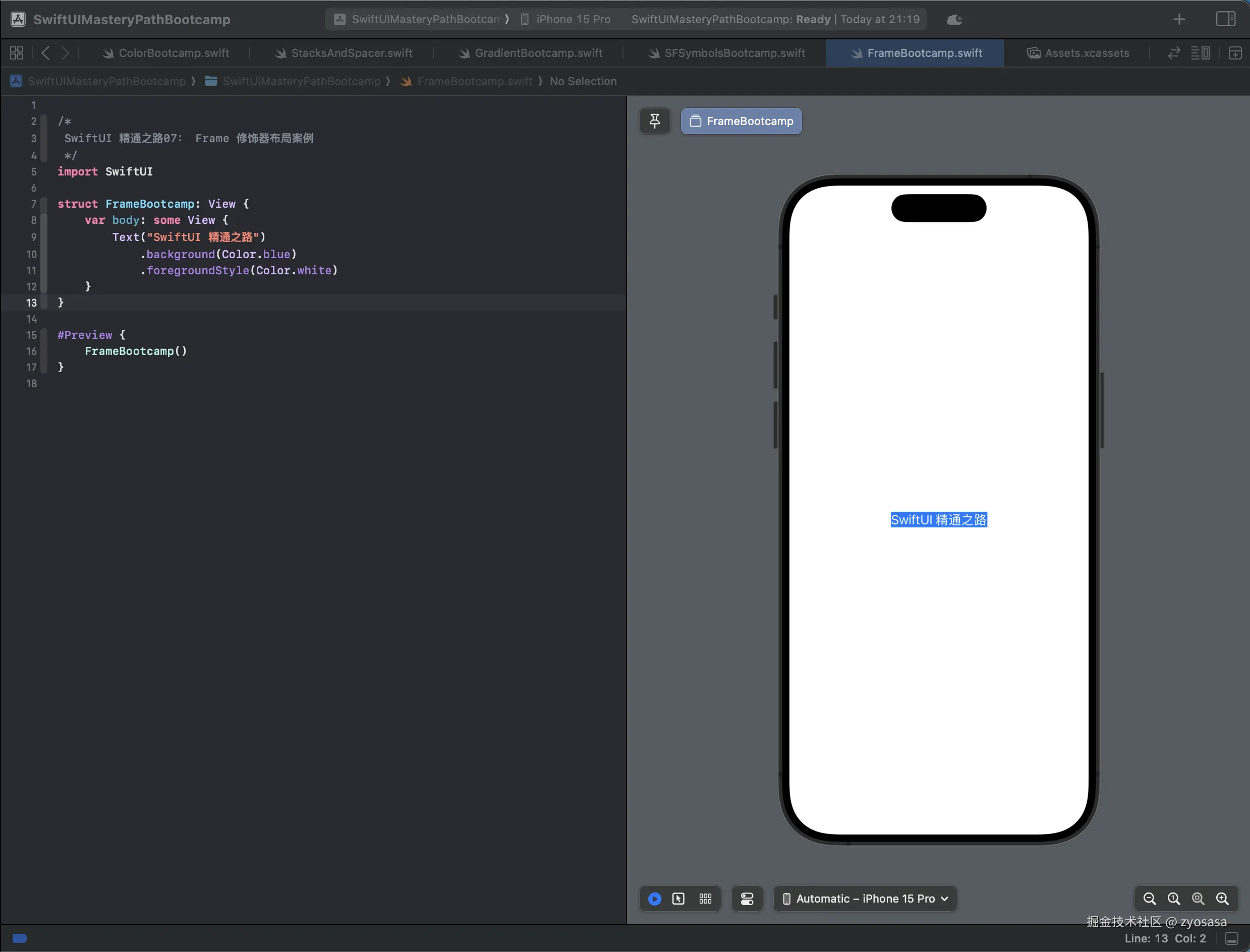 快捷键 Command + N,我们新建文件名为 FrameBootcamp.swift,本章我们主要通过结合简单的案例讲解下frame修饰器。