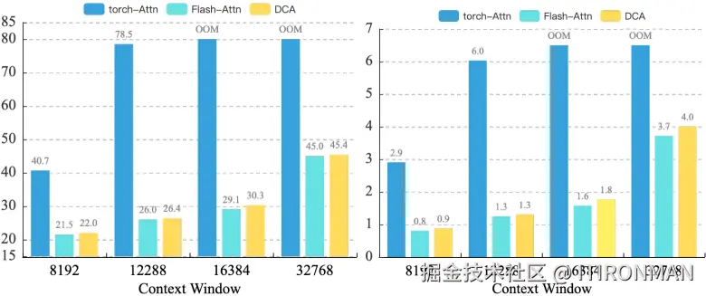 NVIDIA 80G A100 GPU上进行,使用的是Llama2 7B模型测试DCA效果,左图表示GPU使用占比,右图表示推理时间。