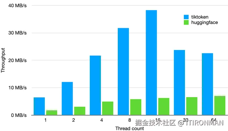 如上图,可以看到tiktoken相比较huggingface的同类开源的编码器快3-6倍。