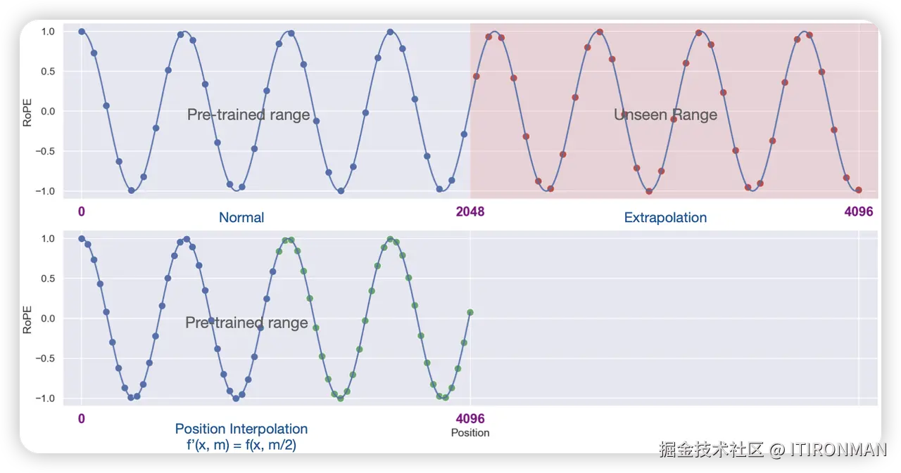 PI是对RoPE编码的一种扩展。假设有模型,其默认上下文长度为 ,对于新的上下文长度 ,编码方式变为 ,然后进行微调即可,下图表示 。