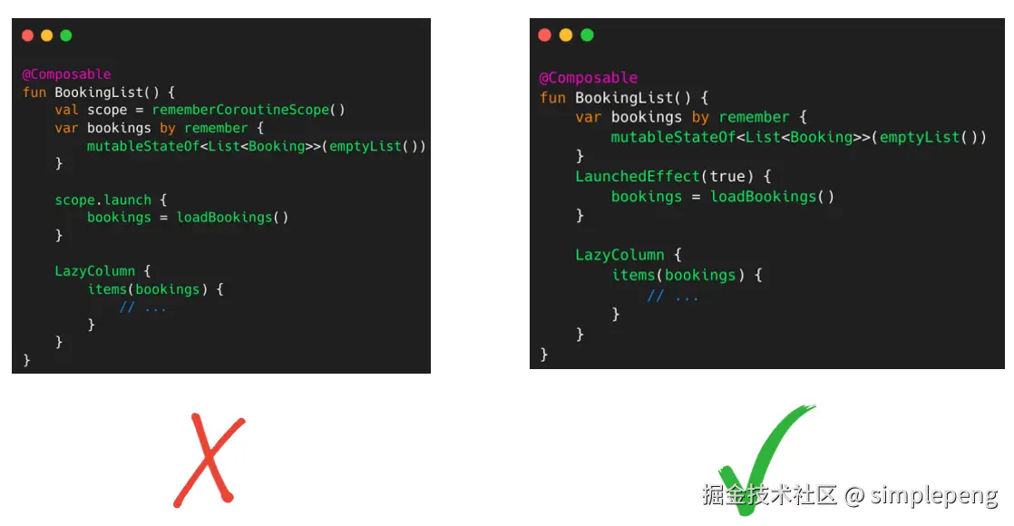上面的示例展示了显示 Booking 类型列表的代码块。当左侧示例中使用remembercoroutinescope时,每次界面重组时都会发出新的网络请求。在右侧的 Launched Effect 示例中,重组不受重组状态的影响,仅在第一次加载屏幕时才会发出请求。