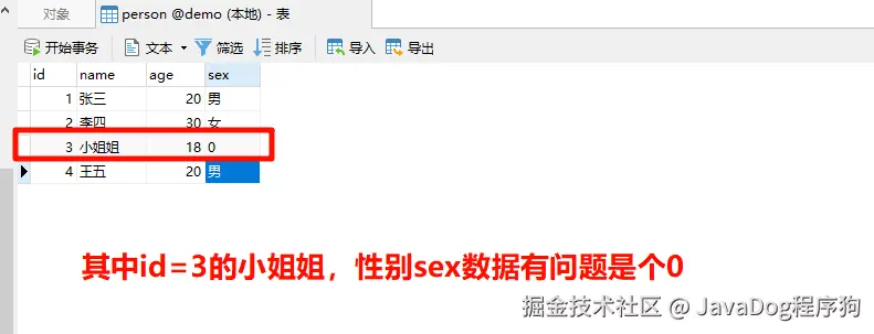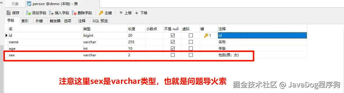 一个person表,假设其中有sex性别字段类型为varchar,0代表女,1代表男,建表如下