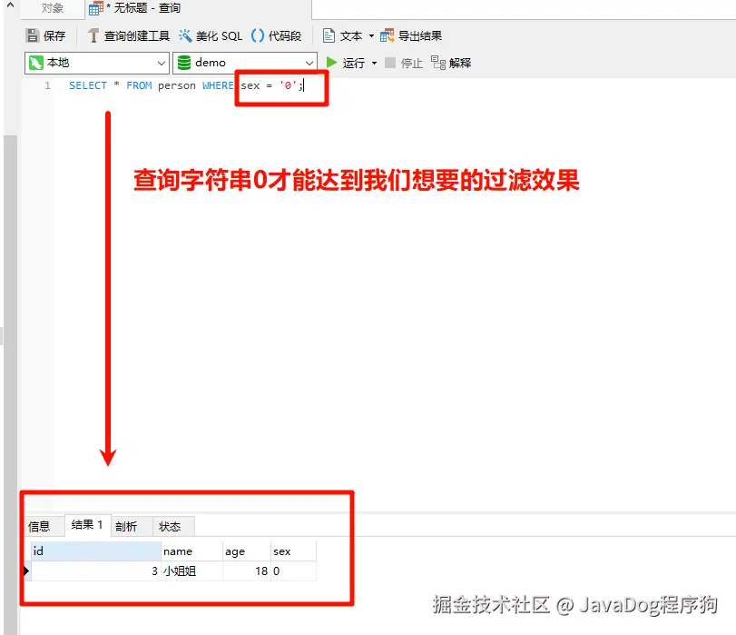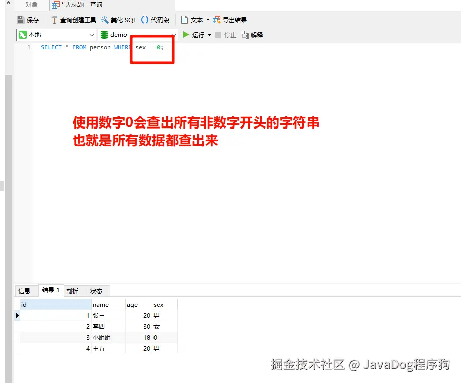 SELECT * FROM person WHERE sex = 0; 和 SELECT * FROM person WHERE sex = '0';